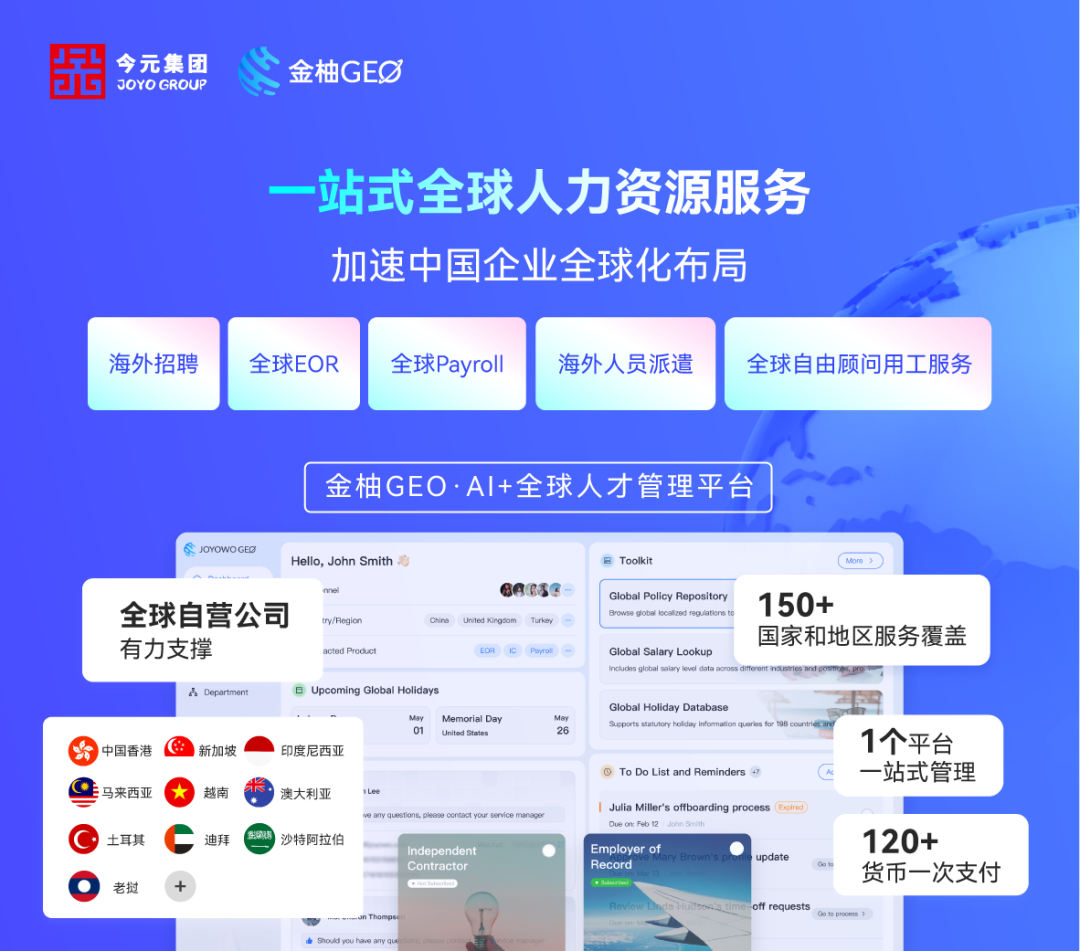 ■ AI技术赋能跨境管理:依托自研的“金柚GEO・AI+全球人才管理平台”,今元集团将技术创新融入跨境人力资源管理全流程模块,满足企业全球用工的基础管理需求。平台聚焦AI前沿技术研发,通过MCP支持多智能体(AI Agent)协同,可自动化智能完成跨境员工入离职、假期、薪酬核算发放等环节,同时AI政策中枢24小时监测全球政策,帮助企业降本合规。平台联动上下游协同生态,重新构建跨境用工全链路管理范式,为中国企业全球化运营注入合规化、智能化、高效化的核心驱动力,助力企业全球化业务加速扩张。