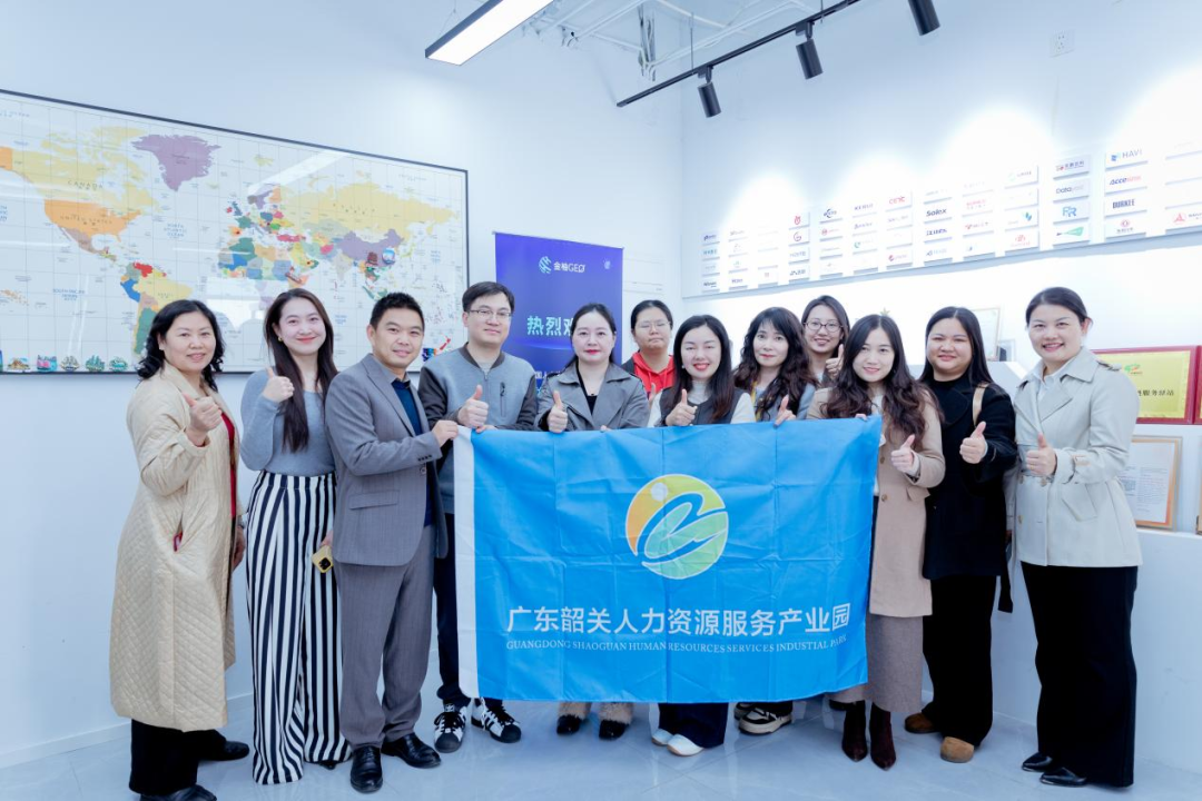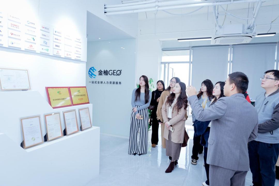 11月27日,韶关市人社局党组成员、副局长张军,市场科科长刘峥,广东韶关人力资源服务产业园运营总监丘婷婷,以及韶关市粤凯人力资源服务有限公司、中智广州经济技术合作有限公司韶关分公司等本地人力资源服务机构负责人,走进位于光谷(东湖高新区)的金柚GEO全球总部。今元集团助理总裁裘东萍、集团保障中心副总裁马莉,集团旗下金柚GEO首席执行官(CEO)徐铁诚、首席运营官(COO)肖键等热情接待。调研团一行详细了解今元集团及旗下金柚GEO的发展模式、业务布局与创新成果,双方就人力资源服务行业如何对接全球资源、提升服务能级、助力区域企业出海等关键议题展开了深入探讨。