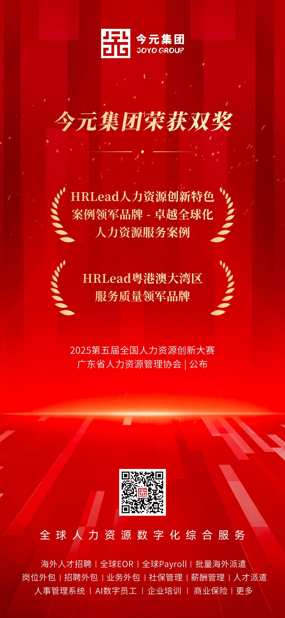 近日,广东省人力资源管理协会公布2025第五届全国人力资源创新大赛领军品牌获奖名单,今元集团以卓越的全球化服务能力与服务品质,一举斩获“HRLead人力资源创新特色案例类领军品牌-卓越全球化人力资源服务案例”“HRLead粤港澳大湾区服务质量领军品牌”双项殊荣,成为行业创新与服务标杆的有力践行者。