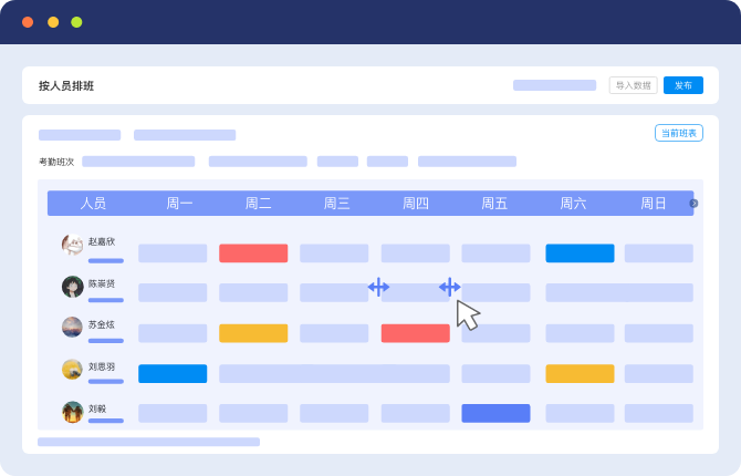 智能排班模块:支持“多人多岗多班次”灵活配置,在线批量排、循环排,一键生成排班表;