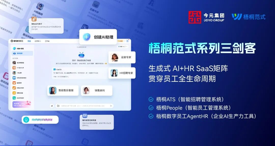 依托数字化技术,今元集团聚焦企业人力资源管理的全流程痛点,打造出极具行业影响力的人力资源数字化产品矩阵,构建起覆盖从招聘到员工全生命周期管理的全闭环数字化管理体系。今元集团旗下梧桐范式系列生成式AI+HR SaaS产品矩阵,基于对国内企业用工需求的深度洞察,包含梧桐ATS(智能招聘管理系统)、梧桐People(智能员工管理系统)和梧桐数字员工(AI生产力工具)的系列AI+HR数字化工具,实现了人力资源服务各环节的有机融合与数据互通,有效提升了人力资源配置效率。