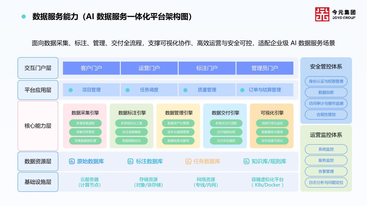 以AI技术应用为核心,开展智慧领域专业人才供给保障与项目成果交付一站式服务,今元集团为企业提供“数据资产化+人才专业化”一体化解决方案,聚焦AI数据处理服务、数据治理、高质量数据集建设等核心方向,将数据要素与人才资源深度协同,呼应“十五五”时期数实融合与新质生产力培育的发展要求,为“AI+”产业、智能制造、生物医疗、新能源、信息科技、语言服务等领域企业提供全链条数字化解决方案。