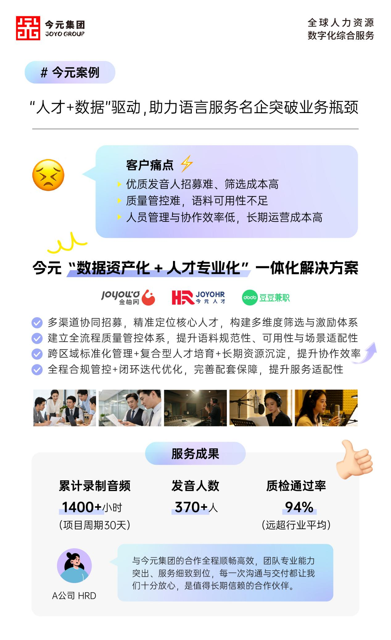 本次合作中,今元集团将人力资源服务与AI数据处理服务深度融合,助力客户实现语料数据资产化升级,夯实其在AI语言技术领域的核心竞争力。