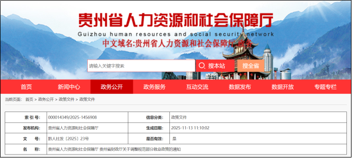 贵州省人力资源和社会保障厅、贵州省财政厅发布《关于调整规范部分就业政策的通知》,从文件下发之日起执行,执行期限至2028年底。