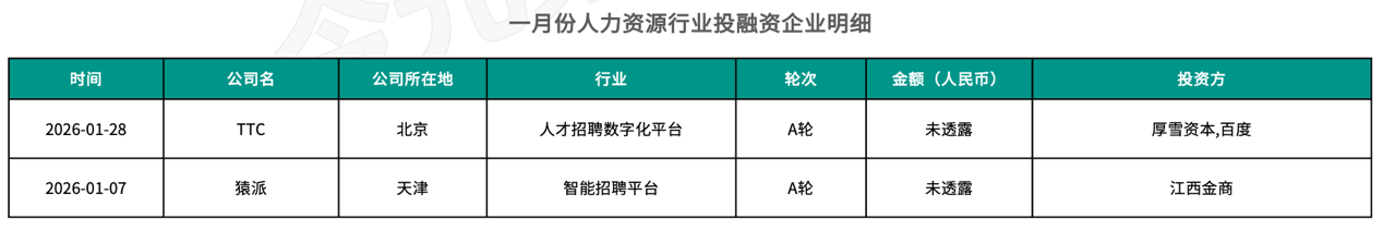 1月,国内人力资源领域发生了两起投融资事件,是来自天津的智能招聘平台猿派获得A轮融资以及来自北京的人才招聘数字化平台TTC才多对获得的A轮融资,融资金额均未透露。