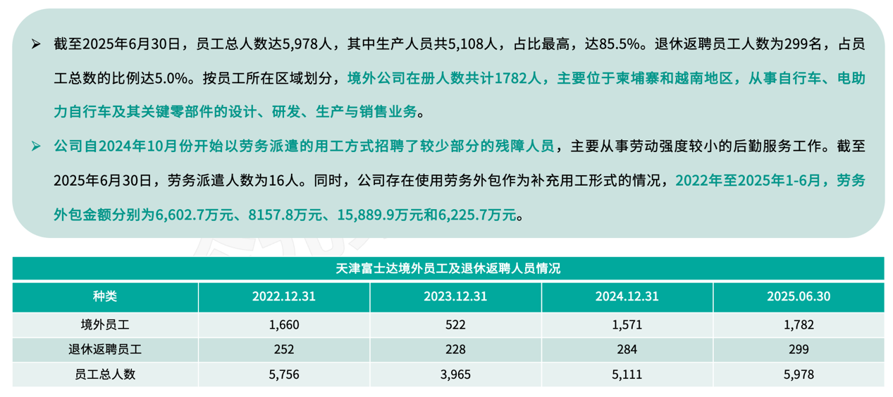 - 天津富士达:主要从事自行车、共享单车、电助力自行车等产品及其关键零部件的研发、设计、生产与销售业务。境外员工人数超千人,退休返聘人员规模持续扩大,劳务外包用工需求增长,以劳务派遣方式雇佣残疾人员从事后勤工作。