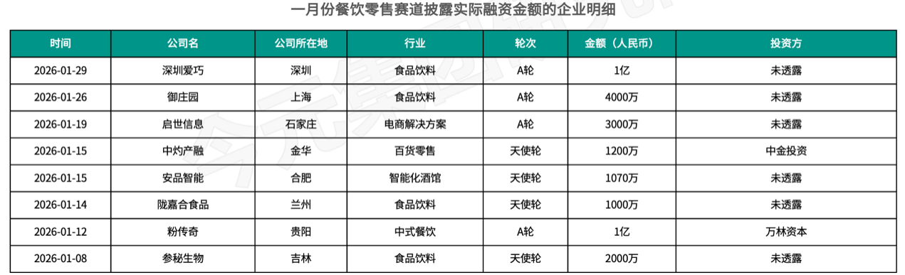 1月,国内餐饮赛道共发生6起融资事件,其中有实际披露融资金额的企业中,是来自贵州贵阳的中式餐饮企业粉传奇获得最高1亿元的A轮融资。零售赛道发生了26起融资事件,其中有实际披露融资金额的企业中,融资金额最高的是来自深圳的食品饮料生产商深圳爱巧,其获得1亿元的A轮融资。