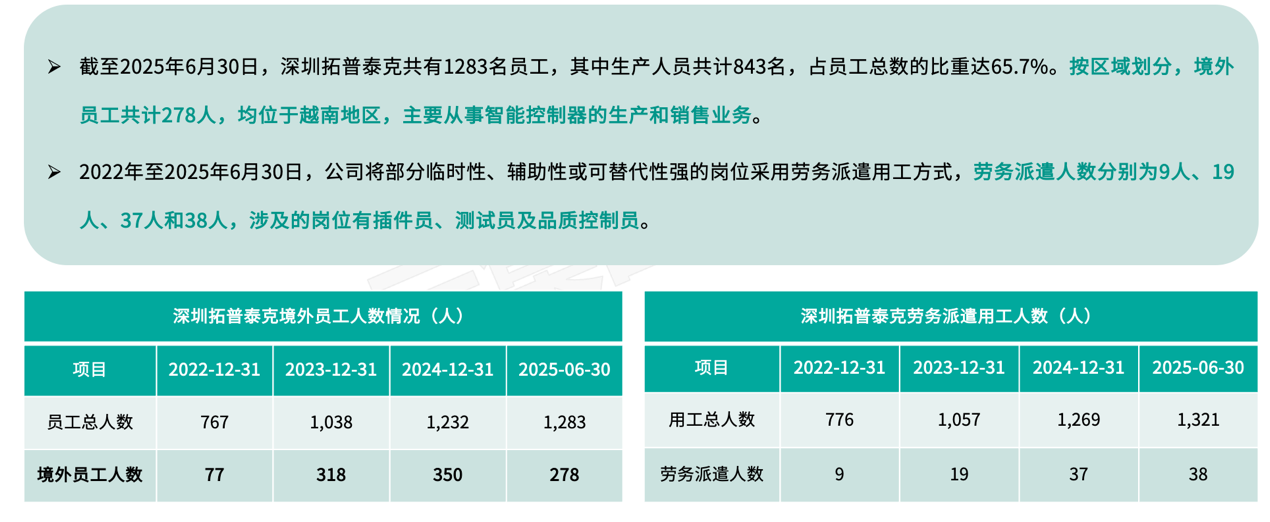 - 深圳拓普泰克:从事智能控制器及智能产品的研发、生产和销售。生产人员为核心用工场景,境外员工均位于越南,从事生产和销售业务。部分辅助性岗位采用劳务派遣用工方式,劳务派遣人数逐年增长。