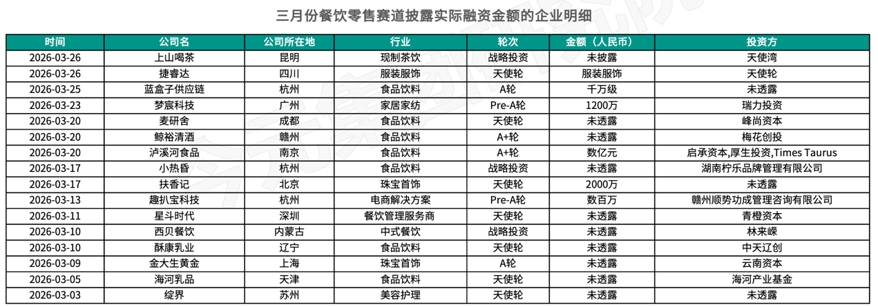 3月,国内餐饮赛道共发生3起融资事件,均未披露实际融资金额。零售赛道发生了14起融资事件,其中有实际披露融资金额的企业中,融资金额最高的是来自北京的珠宝首饰零售商扶香记,其获得2000万元的天使轮融资。