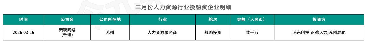 3月,国内人力资源领域发生了一起投融资事件,是来自苏州的人力资源服务商聚聘网络获得的战略投资,具体融资金额暂未透露。