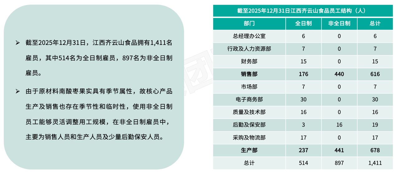 - 江西齐云山食品:主要销售南酸枣食品产品的果类零食公司。非全日制员工占比超60%,在生产辅助环节采用劳务派遣用工方式。