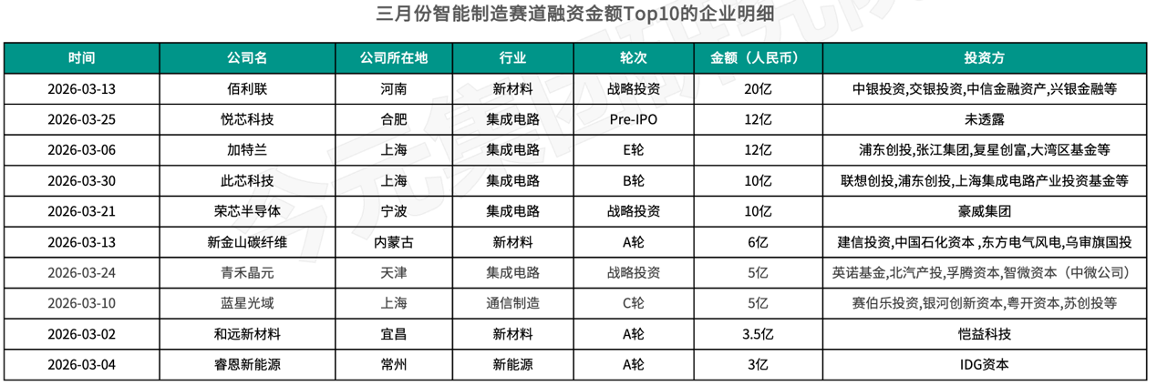 3月,智能制造领域一共完成377次融资,本月融资次数最高的是集成电路赛道完成的105次融资,其次是新材料赛道完成的55次融资,再次是新能源赛道完成的48次融资。智能制造行业本月融资金额最高的是新材料赛道的河南佰利联完成的20亿元人民币战略投资。