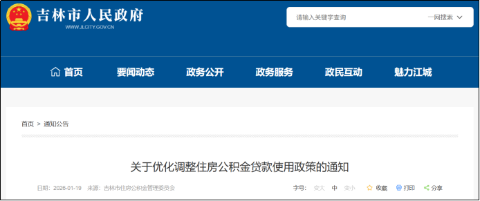 1月19日,吉林市住房公积金管理中心发布《关于优化调整住房公积金贷款使用政策的通知》,自发布之日起正式实施。