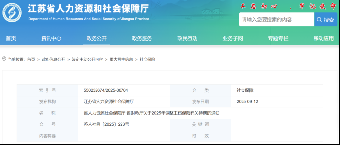 2025年9月12日,江苏省人社厅、省财政厅联合印发《关于2025年调整工伤保险有关待遇的通知》,统一调整全省参保工伤职工伤残津贴、生活护理费、供养亲属抚恤金等三项定期待遇,自2025年1月起执行。