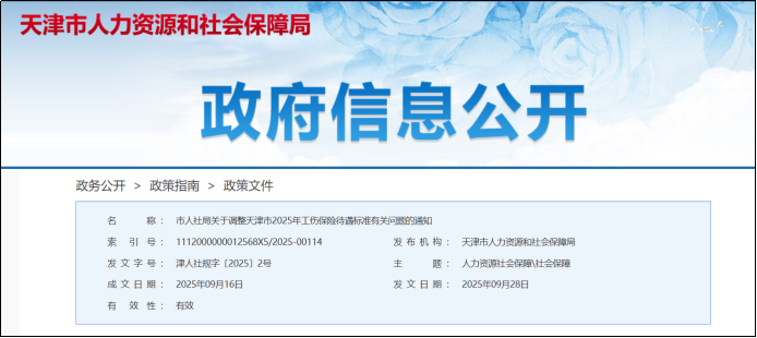 9月28日,天津市人社局印发《关于调整天津市2025年工伤保险待遇标准有关问题的通知》,自2025年1月1日起执行。