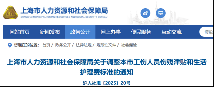 9月22日,上海市人力资源和社会保障局发布《关于调整本市工伤人员伤残津贴和生活护理费标准的通知》,自2025年10月1日起施行。
