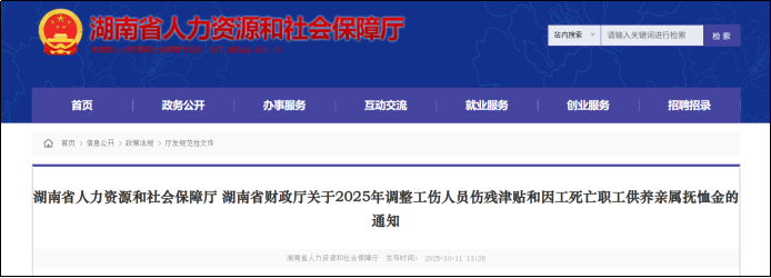 10月11日,湖南省人社厅财政厅发布关于关于2025年调整工伤人员伤残津贴和因工死亡职工供养亲属抚恤金的通知,从2025年1月1日起施行。