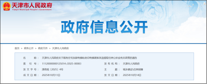 10月14日,天津发布《关于既有住宅加装电梯和老旧电梯更新改造提取住房公积金有关政策的通告》,自10月14日起施行,有效期5年。