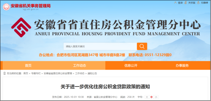 10月1日,安徽省住房公积金管理中心发布《关于进一步优化住房公积金贷款政策的通知》,自2025年10月1日起施行,有效期5年。