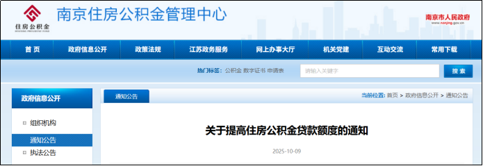 10月9日,南京市住房公积金管理中心发布《关于提高住房公积金贷款额度的通知》,通知自2025年10月9日起施行,有效期至2027年12月31日。