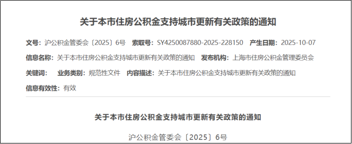 上海市住房公积金管理委员会10月7日发布《关于本市住房公积金支持城市更新有关政策的通知》,自2025年10月7日起施行,有效期五年。