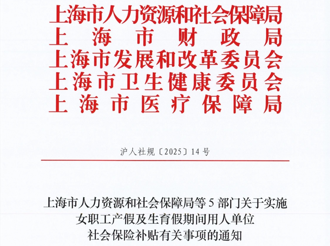 上海市人社局等5部门发布《关于实施女职工产假及生育假期间用人单位社会保险补贴有关事项的通知》。该通知自2025年7月18日起施行,有效期至2030年7月17日止。