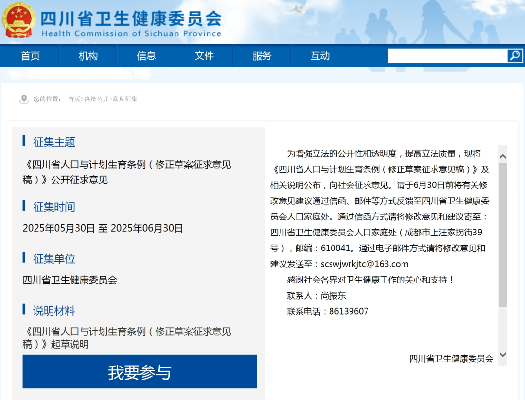 此前,四川省卫生健康委员会官网发布《四川省人口与计划生育条例(修正草案征求意见稿)》,对婚假、生育假等内容进行调整。征集时间为2025年5月30日至2025年6月30日。