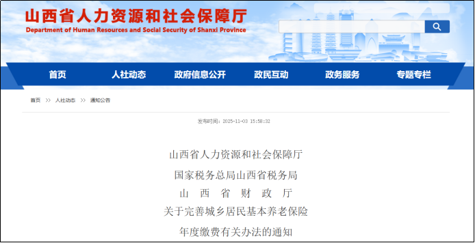11月3日,山西省发布《关于完善城乡居民基本养老保险年度缴费有关办法的通知》,从2025年11月1日开始实施,有效期二年。