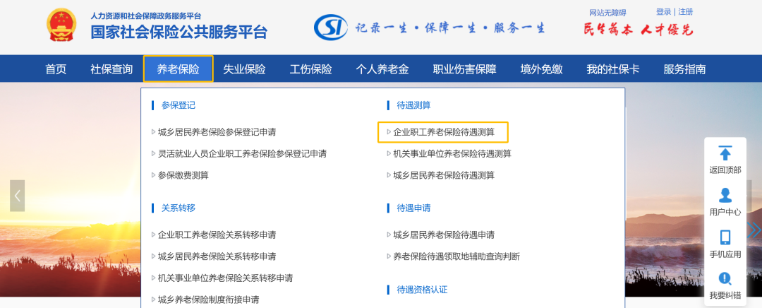 第一步:登录“国家社会保险公共服务平台”(https://12333.gov.cn/),找到“养老保险—企业职工养老保险待遇测算”。