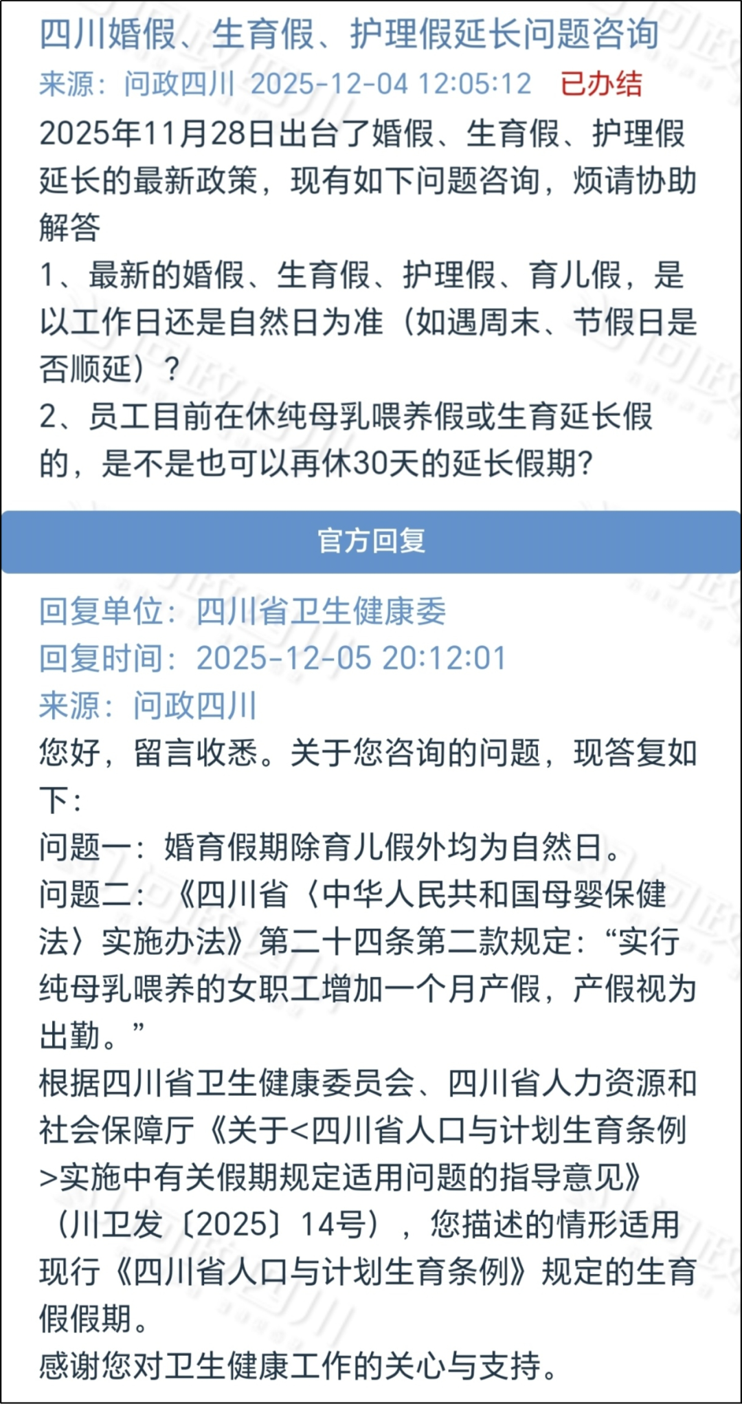 此外,四川省卫生健康委针对网友提出的“婚假、生育假、护理假、育儿假,以工作日还是自然日为准?”问题给出了官方答复。