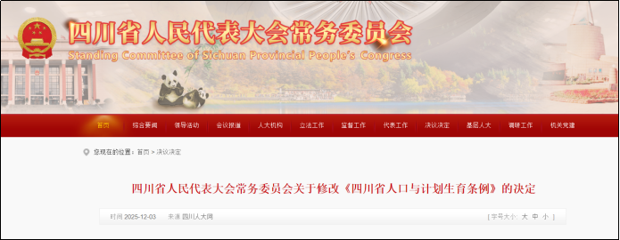 四川省人大常委会于2025年11月26日通过了新修改的《四川省人口与计划生育条例》,并于2025年12月正式公布施行。
