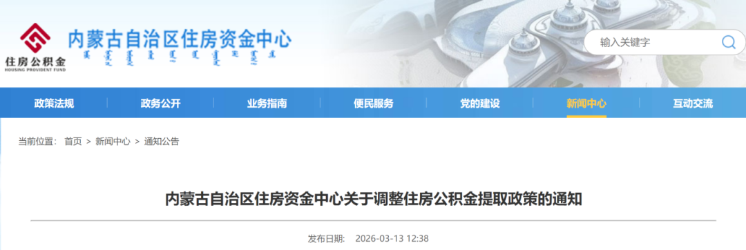 3月13日,内蒙古自治区住房资金中心下发《关于调整住房公积金提取政策的通知》,提出提高租房提取额度及支持提取住房公积金用于支付取暖费、物业服务费、住宅专项维修资金等政策便利。《通知》自2026年3月16日起施行。
