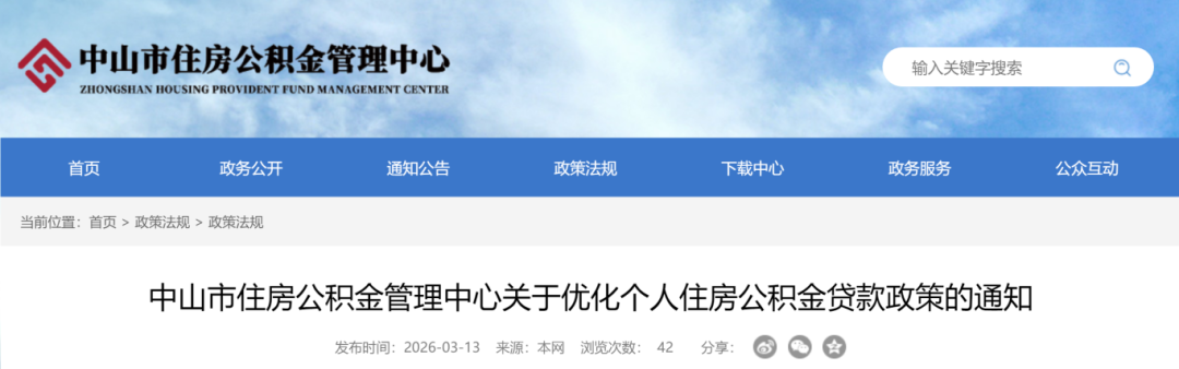 3月13日,中山市住房公积金管理中心发布《关于优化个人住房公积金贷款政策的通知》。该通知自2026年3月16日起实施。