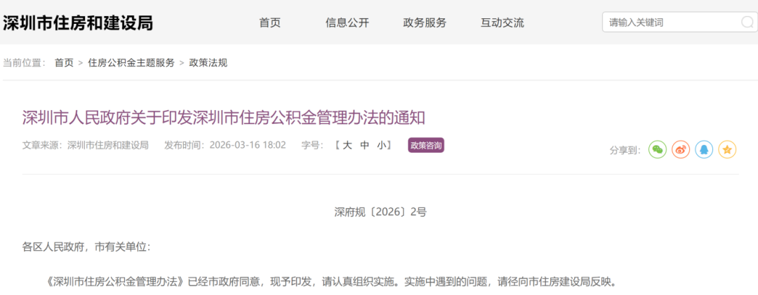 3月16日,深圳市人民政府印发《深圳市住房公积金管理办法》,对2010年12月实施的《深圳市住房公积金暂行办法》全面修订完善。新规聚焦职工住房消费需求,优化缴存机制、扩大覆盖范围、强化权益保障,将于2026年4月1日正式施行。