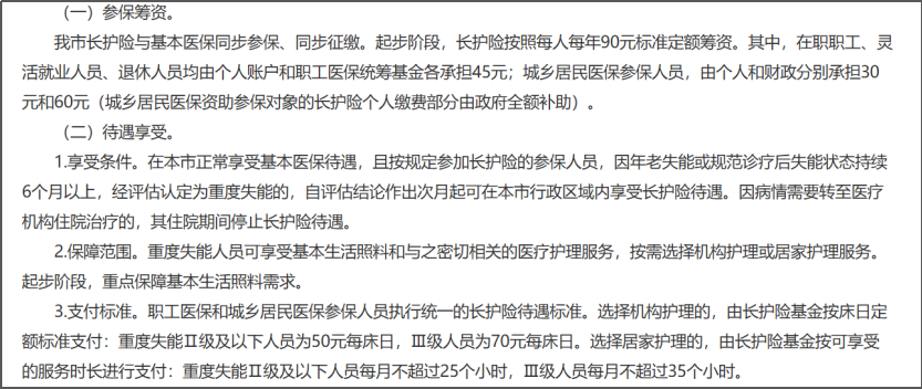 - 机构护理:按床日定额结算。重度失能Ⅱ级及以下:50元/床日;重度失能Ⅲ级:70元/床日。