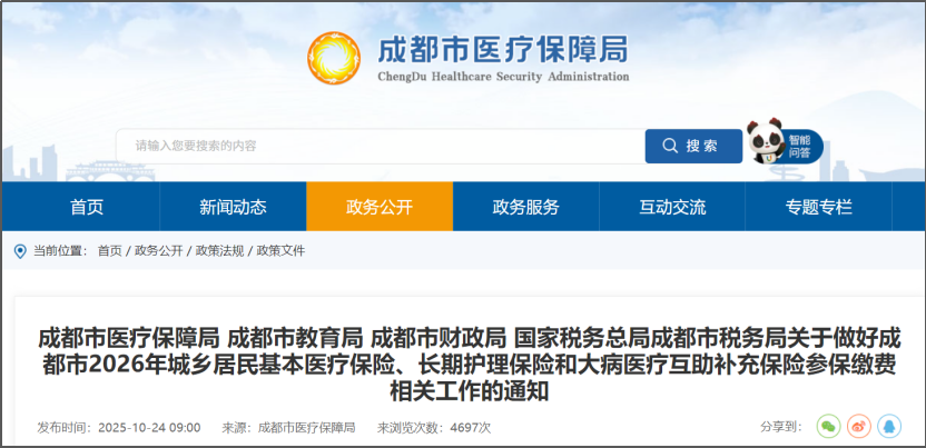近日,成都市医疗保障局发布《关于做好成都市2026年城乡居民基本医疗保险、长期护理保险和大病医疗互助补充保险参保缴费相关工作的通知》,该通知自2025年10月20日起施行,有效期至2026年12月31日。