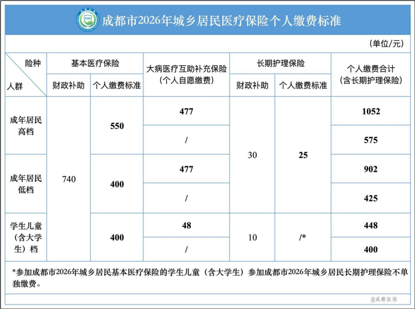 参加成都市2026年城乡居民基本医疗保险的学生儿童(含大学生)参加成都市2026年城乡居民长期护理保险,个人不缴费。