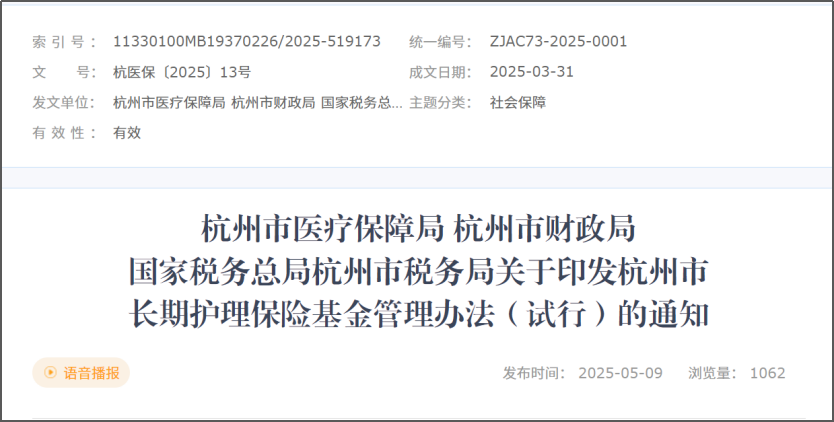 杭州市自2025年1月1日起正式实施长期护理保险制度,实行市级统筹。依据《杭州市长期护理保险试行办法》(杭政办函〔2024〕54号)及《杭州市长期护理保险基金管理办法(试行)》(杭医保〔2025〕13号),明确了服务形式与支付标准。