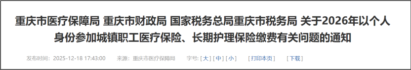 2025年12月17日,重庆市医疗保障局发布《关于2026年以个人身份参加城镇职工医疗保险、长期护理保险缴费有关问题的通知》,明确了2026年以个人身份参加长期护理保险的缴费标准。