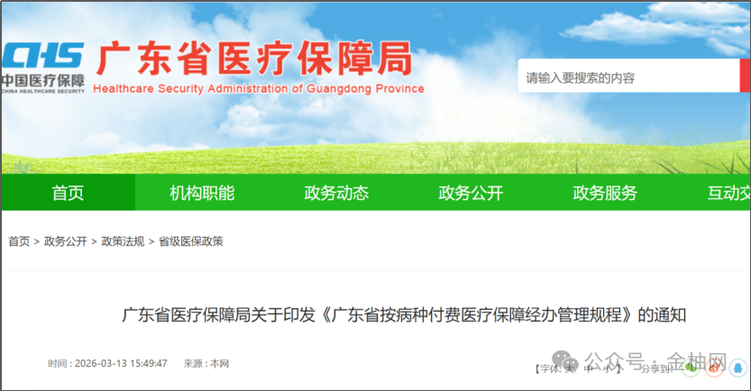 2026年3月13日,广东省医保局印发《广东省按病种付费医疗保障经办管理规程》,自2026年5月1日起施行,有效期5年,从协议管理、数据采集、预算管理、核心要素管理、特殊病例单议、结算清算、审核核查等环节,全面规范按病种付费经办管理工作。