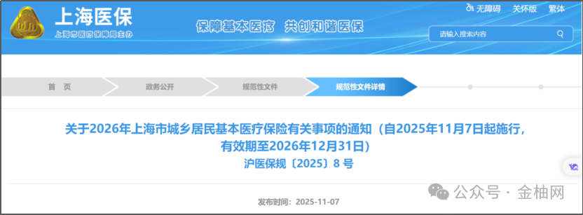 2025年底,上海市医保局联合多部门发布《关于2026年上海市城乡居民基本医疗保险有关事项的通知》(沪医保规〔2025〕8号);《通知》自2025年11月7日起施行,有效期至2026年12月31日;
