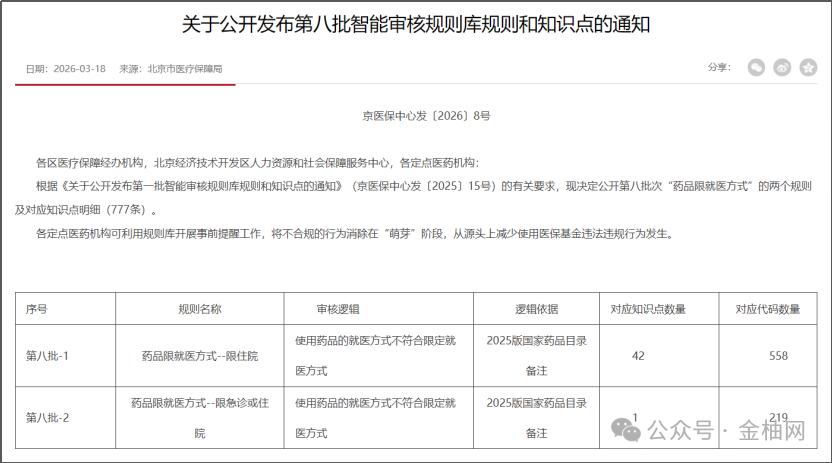 2026年3月18日,北京市医保事务中心于发布《关于公开发布第八批智能审核规则库规则和知识点的通知》(京医保中心发〔2025〕15号)的有关要求,公开第八批次“药品限就医方式”的两个规则及对应知识点明细(777条)。
